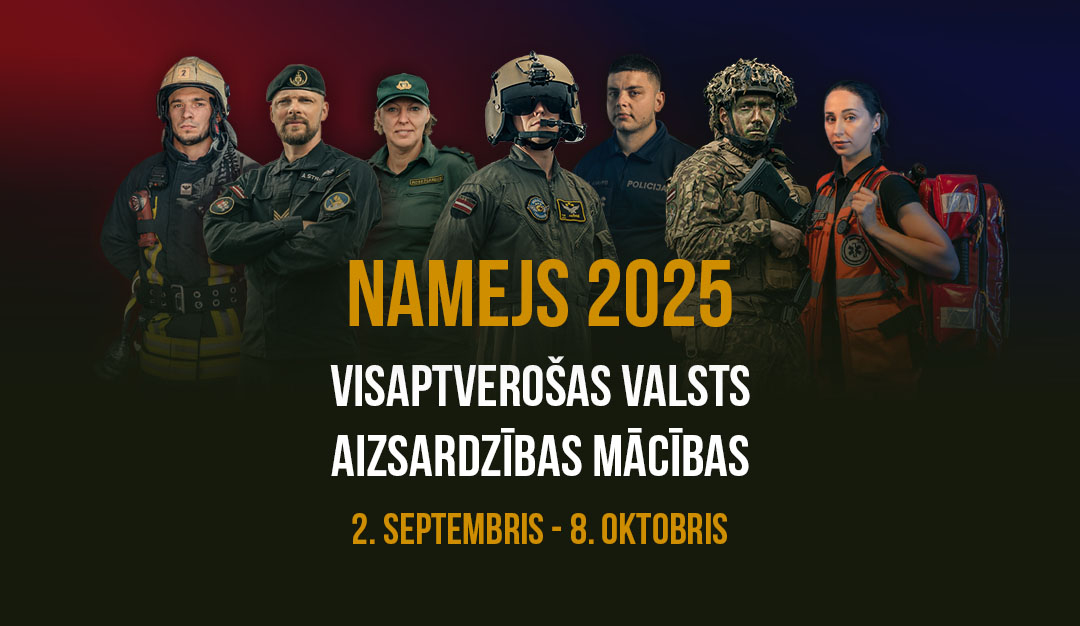 Šodien visā Latvijas teritorijā sākas Nacionālo bruņoto spēku organizētās visaptverošās valsts aizsardzības mācības "Namejs 2025", kurās piedalīsies aptuveni 12 tūkstoši Latvijas un sabiedroto karavīru un zemessargu. Mācības norisināsies līdz 8. septembrim.