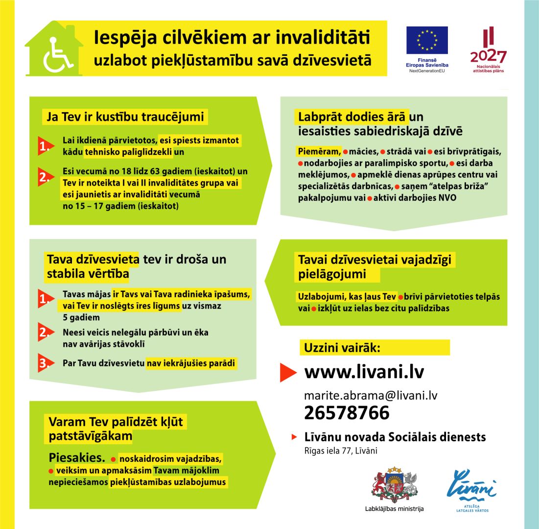Lai uzlabotu dzīves kvalitāti un atvieglotu ikdienu, Līvānu novada pašvaldība aicina iedzīvotājus ar pirmās vai otrās invaliditātes grupu, kā arī pārstāvjus bērniem ar kustību traucējumiem no 15 līdz 17 gadiem, līdz šā gada 15.augustam pieteikties atbalsta pasākumiem mājokļa vides pieejamības nodrošināšanai.