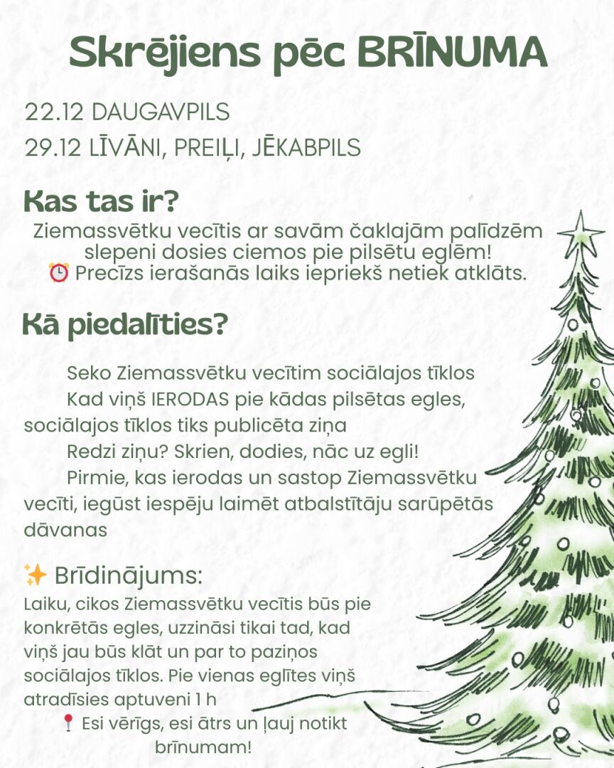 Iedzīvotāji aicināti piedalīties akcijā “Skrējiens pēc brīnuma”, kuras laikā Ziemassvētku vecītis kopā ar palīgiem slepeni apmeklēs vairāku pilsētu galvenās Ziemassvētku egles, tostarp 29. decembrī arī Līvānus.