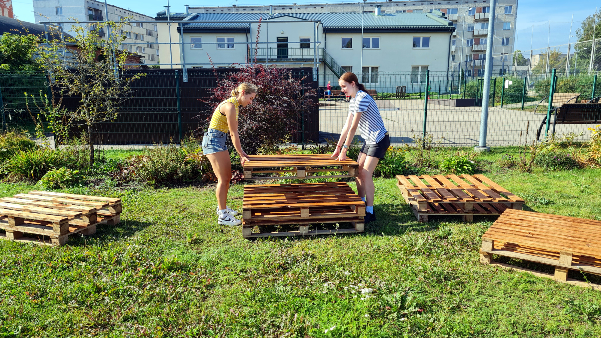 Līvānu novada Multifunkcionālā jaunatnes iniciatīvu centra “Kvartāls” iekšpagalmā valdīja rosība – Līvānu novada Jauniešu domes pārstāvji kopā ar saviem tuviniekiem un centra darbiniekiem aktīvi piedalījās talkā ar mērķi izveidot jaunu atpūtas vietu.