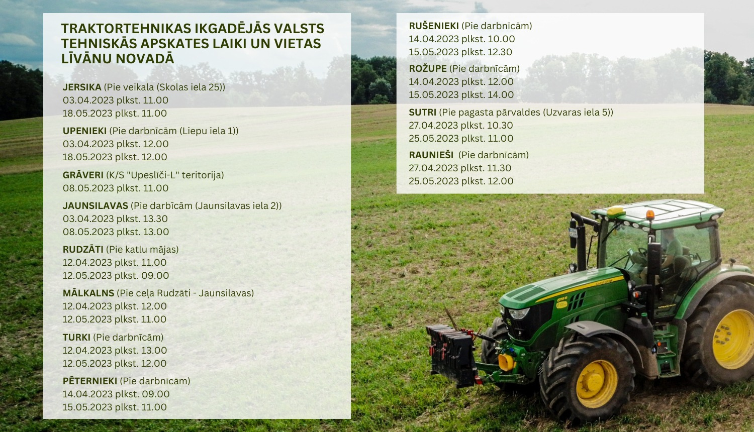 Līvānu novadā, sākot no 3.aprīļa, tiks organizētas ikgadējās valsts tehniskās apskates traktortehnikai. Tehniskās apskates ir obligātas katru gadu, lai traktortehnika varētu piedalīties ceļu satiksmē. Uz apskati līdzi jābūt traktortehnikai un tās reģistrācijas apliecībai, attiecīgās kategorijas traktortehnikas vadītāja apliecībai, kā arī spēkā esošai obligātās civiltiesiskās apdrošināšanas polisei. Samaksa par pakalpojumu ir veicama tikai ar maksājuma kartēm. Pirmās apskates Līvānu novadā būs 3.aprīlī Jersikā, Upeniekos un Jaunsilavās. Sīkāk ar tehnisko apskašu norises vietām un laikiem Līvānu novadā var iepazīties šeit: