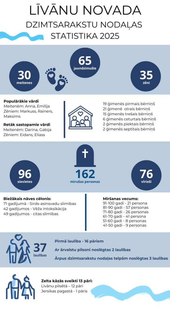 Līvānu novada Dzimtsarakstu nodaļa apkopojusi 2025. gada dzimtsarakstu statistiku, atklājot datus par dzimušajiem, mirušajiem, laulībām un jubilāriem novadā.
