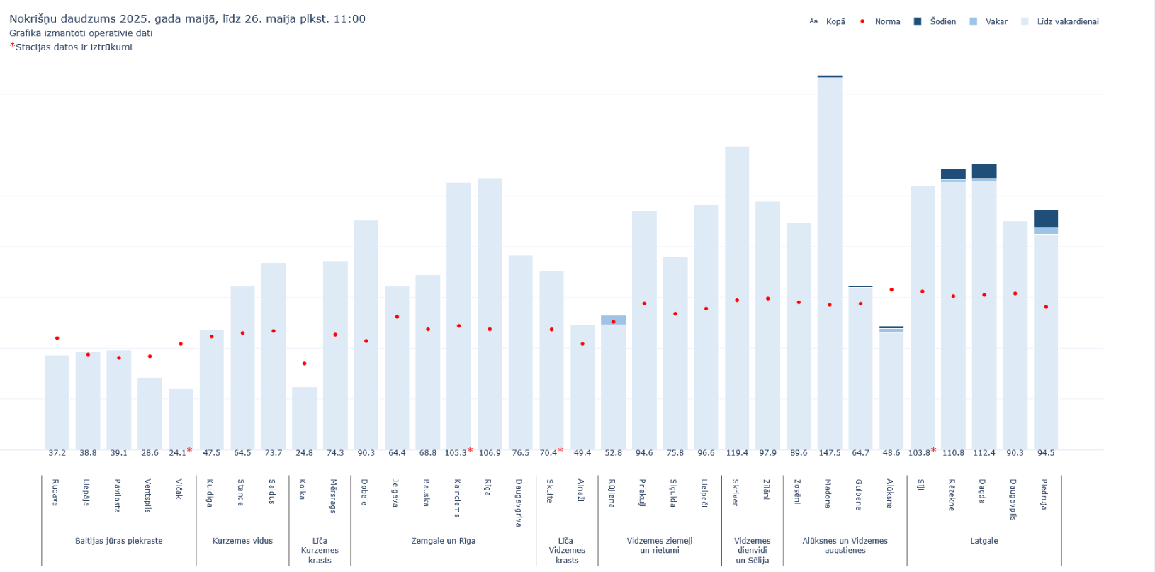 Visā Latvijā nokrišņu daudzums no 1. līdz 25. maijam sasniedzis vidēji 74,3 mm, kas, atkarībā no turpmākā laika, šo mēnesi var ierindot starp 10. līdz 14. lietaināko maiju Latvijas vēsturē.