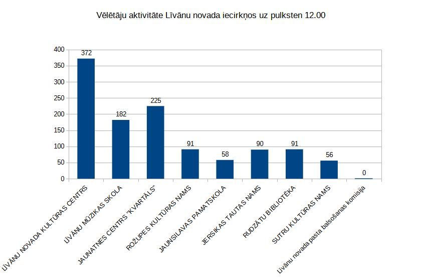 12:20 Līvānu novadā līdz pulksten 12:00 nobalsojuši 1165 iedzīvotāji. Visaugstākā aktivitāte fiksēta Līvānu pilsētas iecirkņos, kur vēlētāju plūsma ir vienmērīga un stabila. Lielākā atsaucība bijusi Līvānu novada kultūras centrā. Zemākā aktivitāte - Sutru Kultūras namā, kur līdz pusdienlaikam nobalsojuši vien 56 iedzīvotāji. Savukārt kopā ar iepriekšējās dienās nodotajām balsīm līdz šim savu izvēli izdarījuši 2 504 jeb 29,76% no 8 414 balsstiesīgajiem.