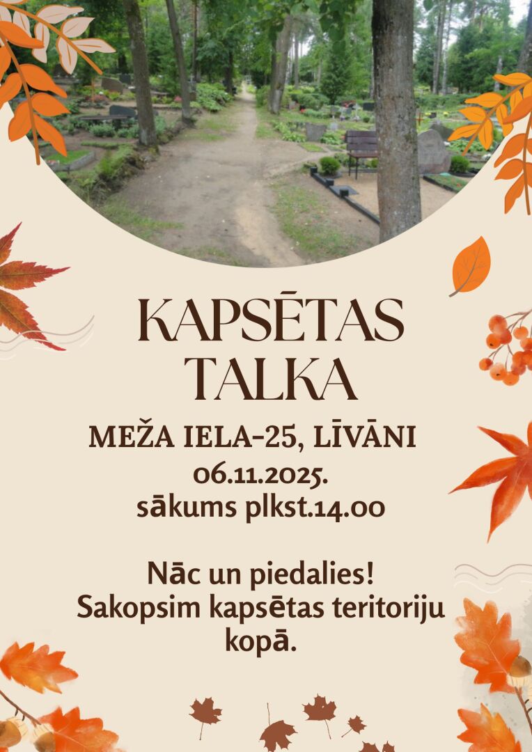 Līvānu novada pašvaldība aicina pilsētas iedzīvotājus ceturtdien, 6. novembrī pulksten 14.00 piedalīties Meža ielas kapsētas sakopšanas talkā.
