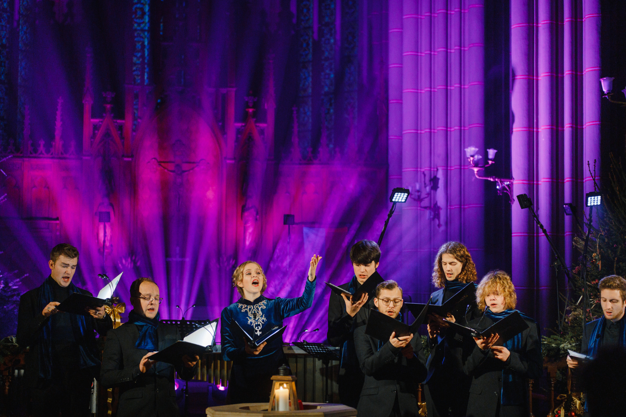 Vīru vokālā grupa – īpaši šim projektam izveidota mūziķu apvienība Aleksandras Špicbergas vadībā. Baznīcas dziedājumu kontekstā to droši varētu saukt arī par vīru kori, jo 10 dziedoņi būtu jau patiešām prāvs un pilnskanīgs draudzes koris. Līdzīgi kā skanējumā tik daudzveidīgie dziedājumi, arī paši dziedātāji, lai arī visi guvuši muzikālu izglītību, ir ar ārkārtīgi atšķirīgām balsīm, dziedāšanas manierēm un pieredzi. Starp dziedātājiem ir gan diplomēti kora diriģenti un profesionālu koru dalībnieki, gan dažādu konfesiju draudžu koristi. Liela daļa dziedātāju ir Rīgas Doma kora skolas zēnu kora absolventi. Tas arī bija viens no uzveduma veidotāju sākotnēji liktajiem uzdevumiem, pulcējot dziedātāju sastāvu, atrast zelta vidusceļu starp akadēmisku un dabisku dziedāšanas manieri, saglabājot autentisku, pirmatnēju balsu skanējumu.