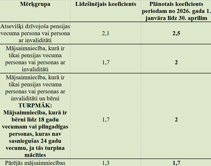 Skaidro Latvijas Pašvaldību savienības padomniece sociālajos un veselības jautājumos Ilze Rudzīte: “Ir vienošanās par to, ka atsevišķi dzīvojošai pensijas vecuma personai vai atsevišķi dzīvojošai personai ar invaliditāti, aprēķinot mājokļa pabalstu, šim minimālajam ienākumu slieksnim tiek piemērots koeficients 2,5. Mājsaimniecībai, kurā ir tikai pensijas vecuma personas vai personas ar invaliditāti, koeficients 2. Mājsaimniecībai, kurā ir tikai pensijas vecuma personas vai personas ar invaliditāti un bērni, tika piedāvāts noteikt koeficientu 2, taču šīs grupas definīcija un sastāvs tika mainīts ar komisijas lēmumu. Turpmāk kā mērķgrupa būs mājsaimniecības, kurās ir bērni līdz 18 gadu vecumam vai pilngadīgas personas, kuras nav sasniegušas 24 gadu vecumu, ja tās turpina mācīties. Atbalsts šai grupai tiek palielināts, pārejas posmā nosakot koeficientu 2. Pārējām mājsaimniecībām ir koeficients 1,7.”