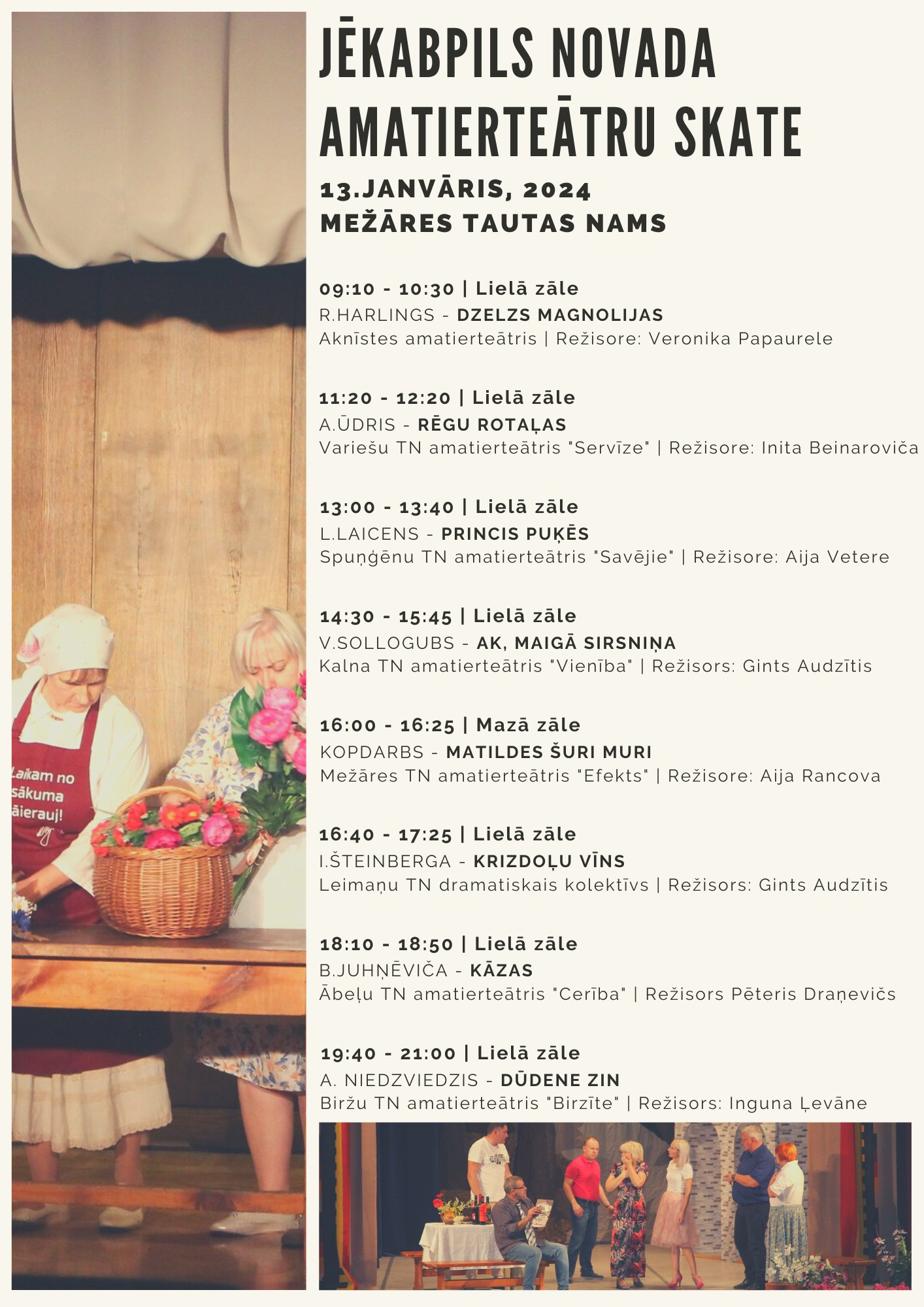 Sestdien, 13.janvārī, Mežāres Tautas namā norisināsies Jēkabpils novada amatierteātru skate, kuras pamatmērķis ir izvērtēt amatierteātru iestudējumu kvalitāti. Skatē piedalīsies astoņi amatierteātri: Aknīstes, Variešu, Spuņģēnu, Kalna, Mežāres, Leimaņu, Ābeļu un Biržu amatierteātri, izspēlējot gan komiskas, gan nopietnas un pārdomas rosinošas epizodes. Arī skatītāji laipni aicināti izmantot iespēju noskatīties izrādes bez maksas. Skates norise plānota visu dienu – no pulksten 9:00 līdz 21:00.