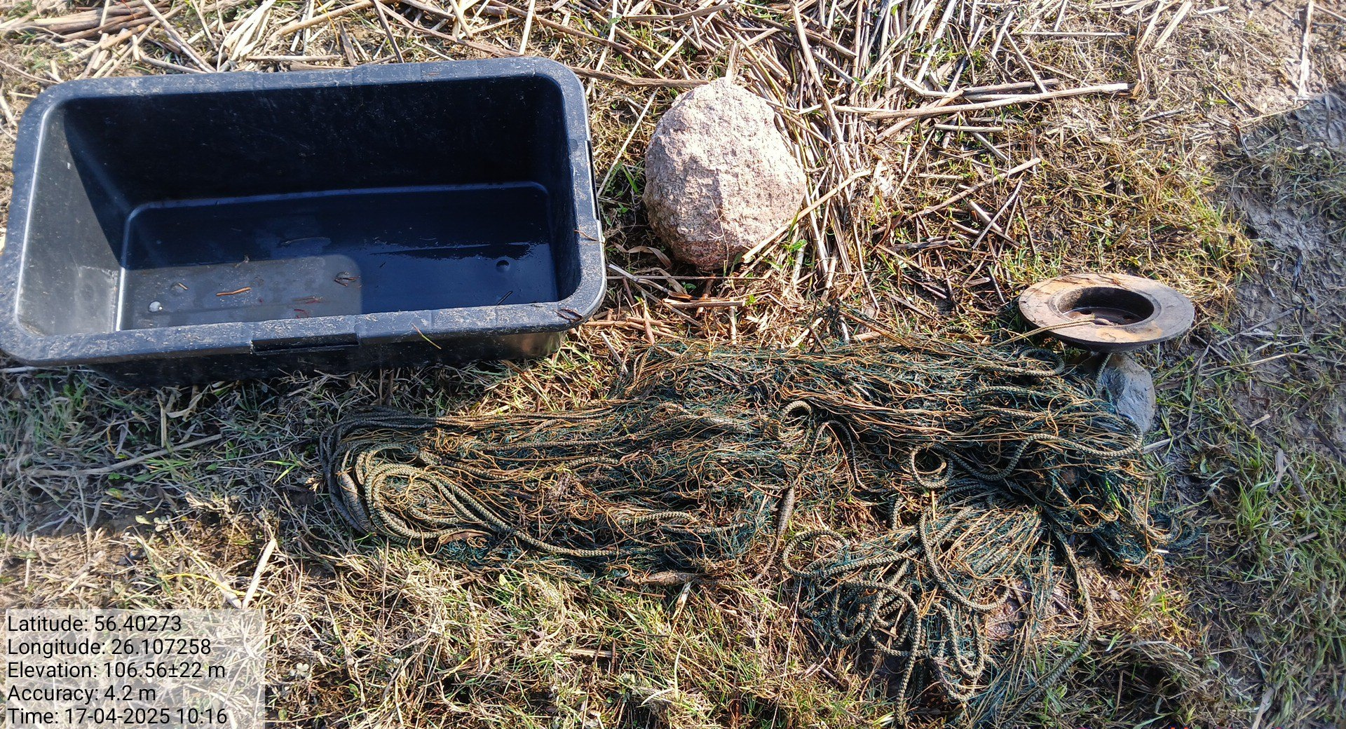 Otrajā pārkāpumā tika konstatēta persona, kas no koka laivas ievietoja ūdenī divus zvejas tīklus. Inspektori konfiscēja abus tīklus – 50 un 30 metru garumā –, kā arī airu laivu.