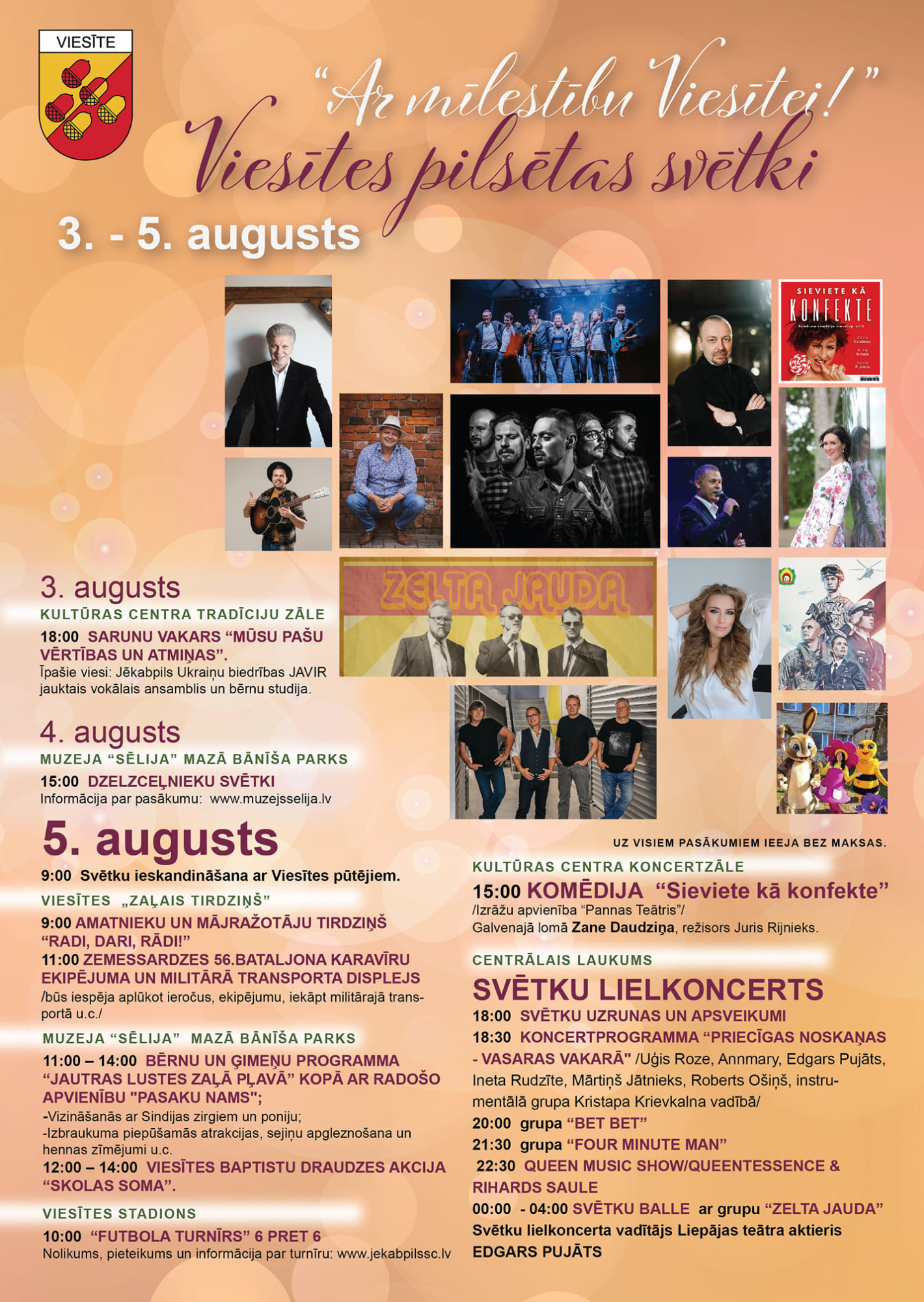 No 3.līdz 5.augustam Viesītē tiks svinēti pilsētas svētki, kuru devīze šogad ir “Ar mīlestību Viesītei!”. 3.augustā būs sarunu un atmiņu vakars, 4.augustā – Dzelzceļnieku svētki, savukārt 5.augustā gaidāma plaša svētku programma. Būs tirdziņš, militārās tehnikas demonstrējumi, atrakcijas un aktivitātes bērniem, teātra izrāde, kā arī vakara koncerts, kurā piedalīsies Uģis Roze, grupa “Bet bet”, “Four minute man”, “Queentessence” un Rihards Saule, kā arī citi mākslinieki.
