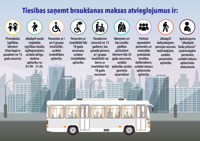- Jēkabpils novada pašvaldības vispārējās izglītības iestāžu Jēkabpils Valsts ģimnāzijas, Jēkabpils 2.vidusskolas, Jēkabpils 3.vidusskolas, Krustpils pamatskolas, Ābeļu pamatskolas, Salas vidusskolas, Zasas vidusskolas, Jēkabpils Agrobiznesa koledžas (deklarēti Jēkabpils novada pašvaldībā un līdz 24 gadu vecumam) izglītojamajiem mācību gada laikā no 1.septembri līdz 31.maijam, reģistrējot braukšanas karti (neierobežots brauciens skaits) un uzrādot konkrētās izglītības iestādes skolēna apliecību – bez maksas;