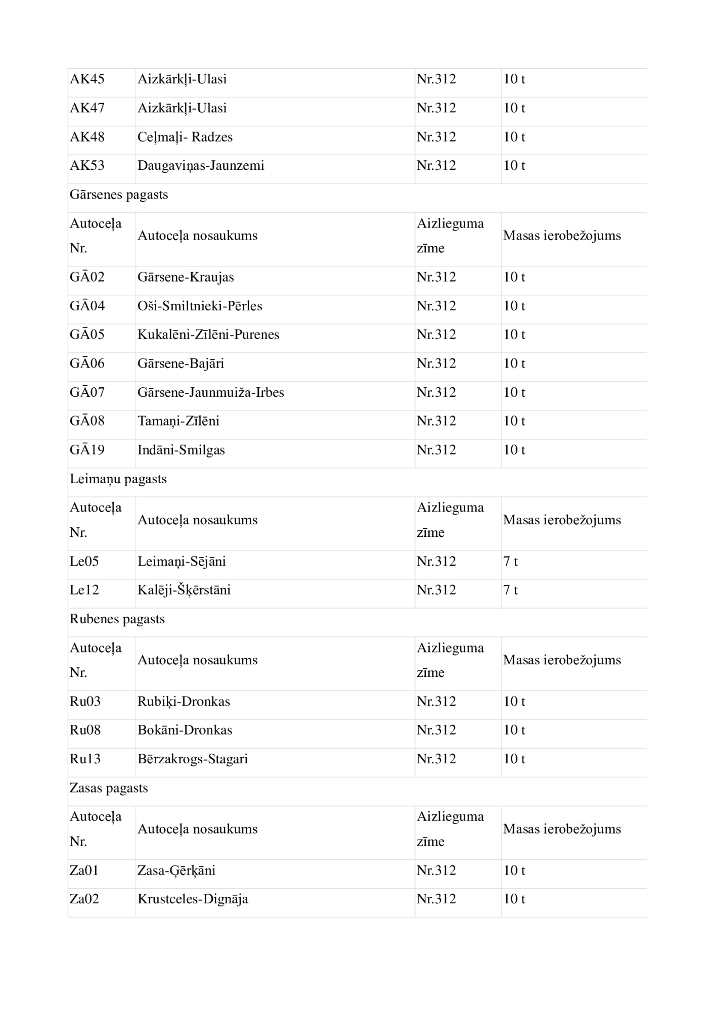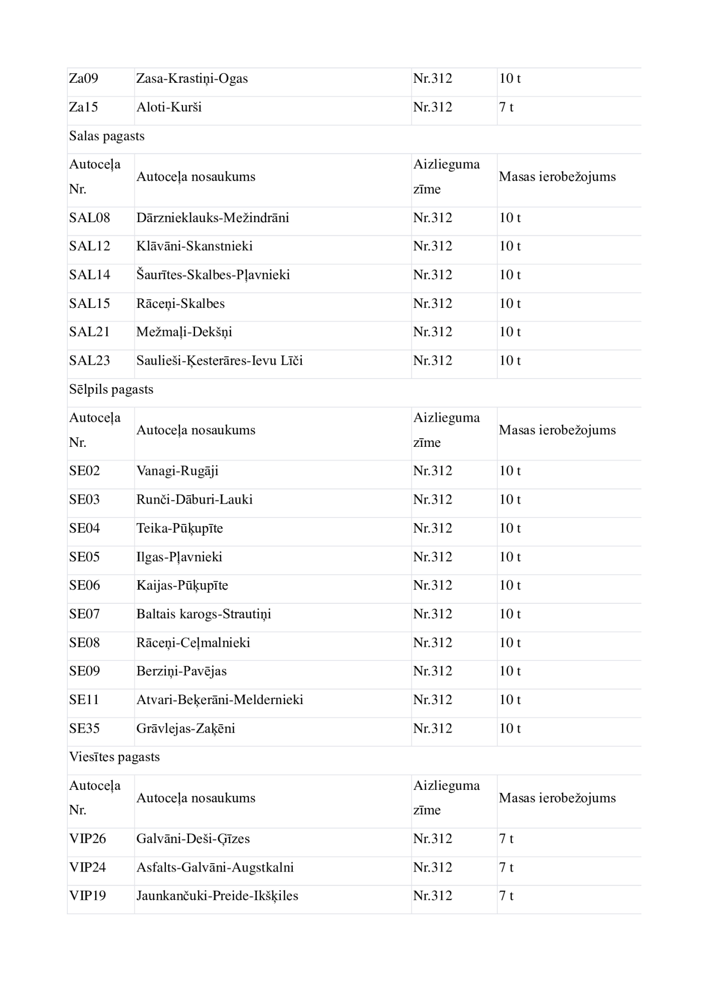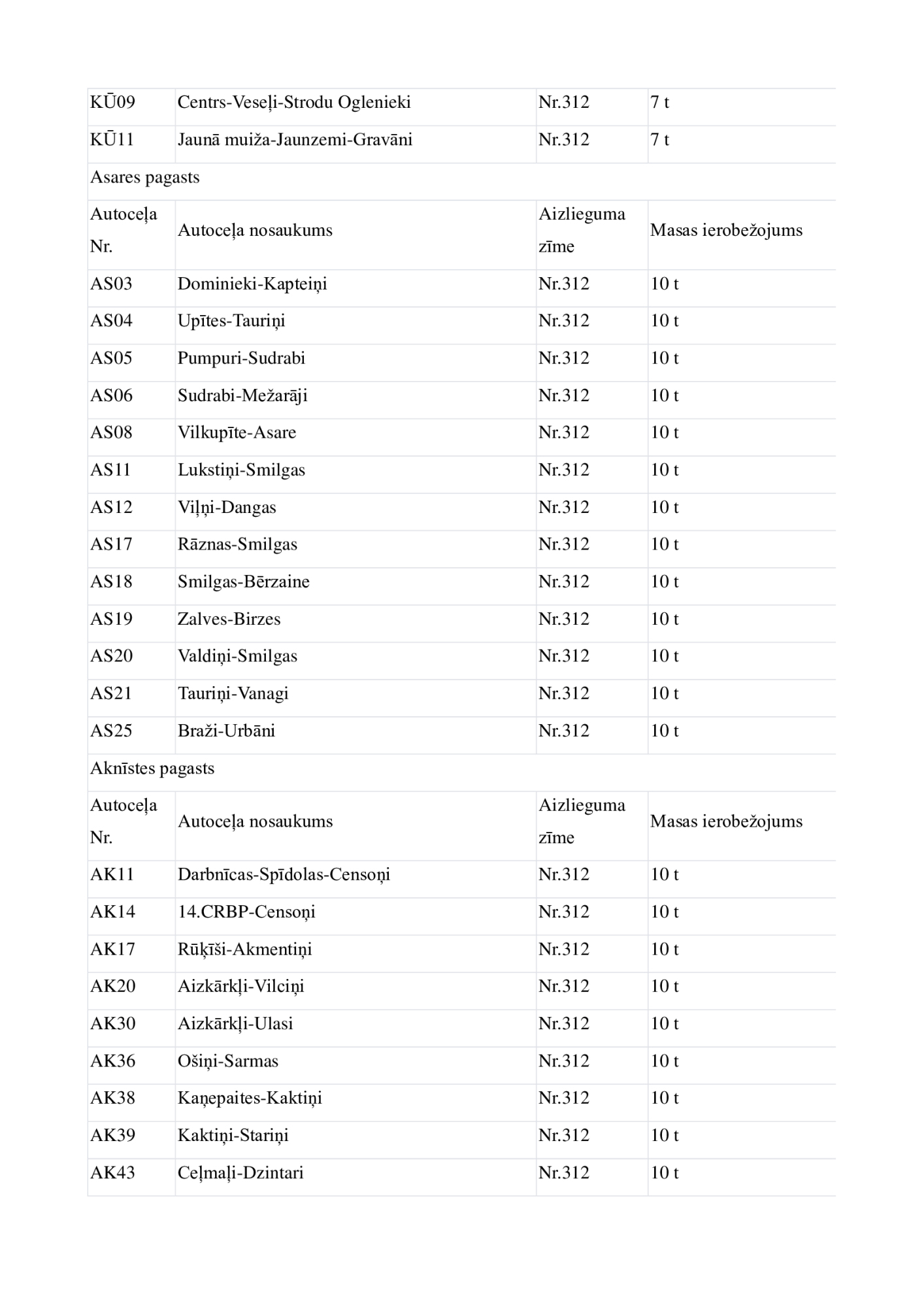Jēkabpils novadā no 6.novembra uz laiku tiek slēgta vai ierobežota transporta kustība uz daudziem pašvaldības autoceļiem, uzstādot transporta masas ierobežojuma vai aizlieguma ceļa zīmes. Transporta masas ierobežojumi noteikti uz kopumā 135 autoceļiem, visvairāk ierobežojumu būs Asares pagastā un Aknīstes pagastā. Lielākajā daļā gadījumu ierobežojumi noteikti transportlīdzekļiem, kuru masa pārsniedz septiņas, 10 vai 11 tonnas. Autotransporta masas ierobežojumus pašvaldība nosaka, lai autoceļi, kuri ir zaudējuši nestspēju, rudens periodā netiktu neatgriezeniski sabojāti. Atbilstoši normatīvajiem aktiem, neievērojot masas ierobežojumu zīmes, var braukt tikai operatīvie transportlīdzekļi, Ceļu satiksmes drošības direkcijā (CSDD) reģistrētie svaigpiena transportlīdzekļi, sabiedriskais transports un transportlīdzekļi, kas veic kritušu lopu izvešanu.