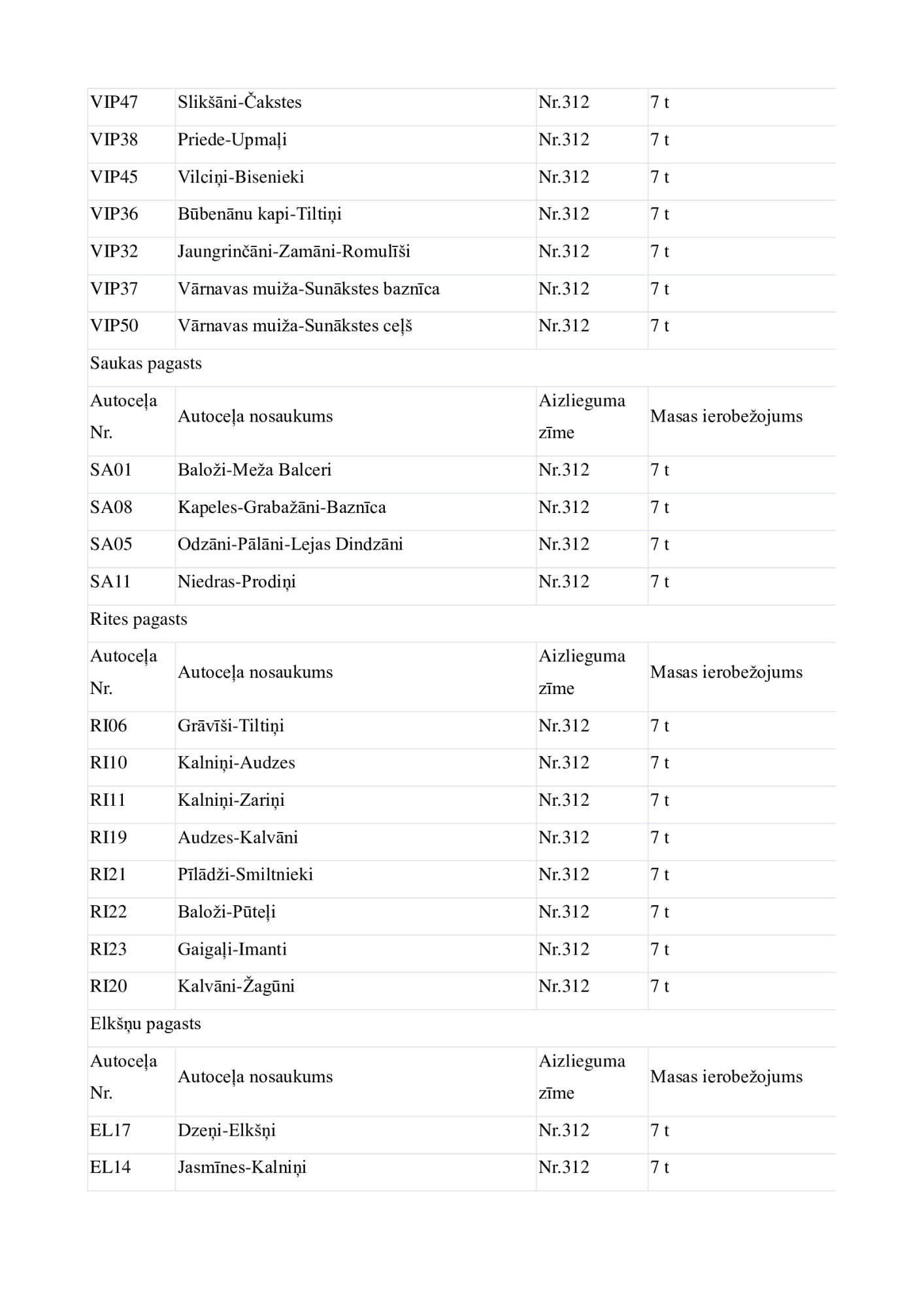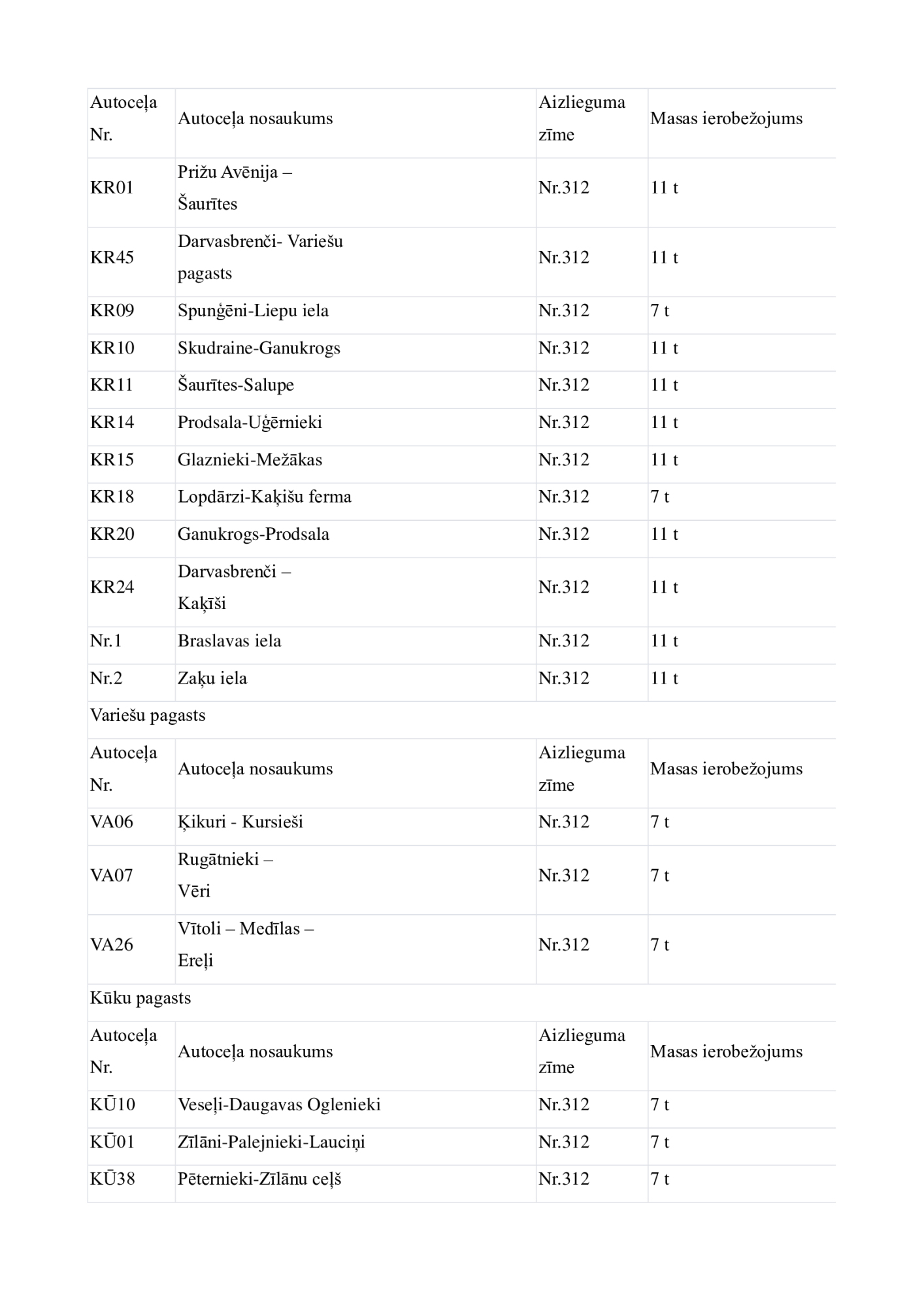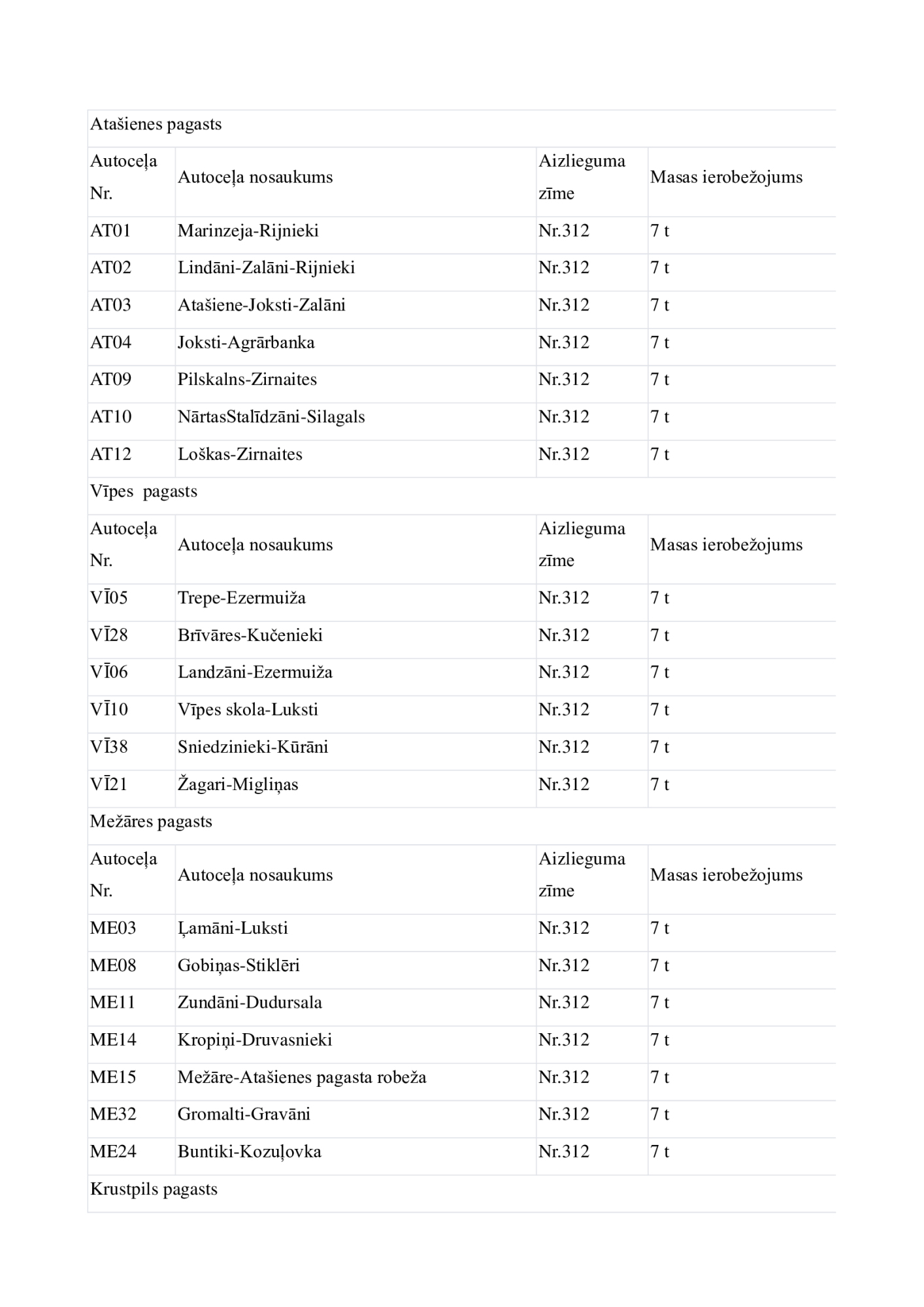 Jēkabpils novadā no 6.novembra uz laiku tiek slēgta vai ierobežota transporta kustība uz daudziem pašvaldības autoceļiem, uzstādot transporta masas ierobežojuma vai aizlieguma ceļa zīmes. Transporta masas ierobežojumi noteikti uz kopumā 135 autoceļiem, visvairāk ierobežojumu būs Asares pagastā un Aknīstes pagastā. Lielākajā daļā gadījumu ierobežojumi noteikti transportlīdzekļiem, kuru masa pārsniedz septiņas, 10 vai 11 tonnas. Autotransporta masas ierobežojumus pašvaldība nosaka, lai autoceļi, kuri ir zaudējuši nestspēju, rudens periodā netiktu neatgriezeniski sabojāti. Atbilstoši normatīvajiem aktiem, neievērojot masas ierobežojumu zīmes, var braukt tikai operatīvie transportlīdzekļi, Ceļu satiksmes drošības direkcijā (CSDD) reģistrētie svaigpiena transportlīdzekļi, sabiedriskais transports un transportlīdzekļi, kas veic kritušu lopu izvešanu.