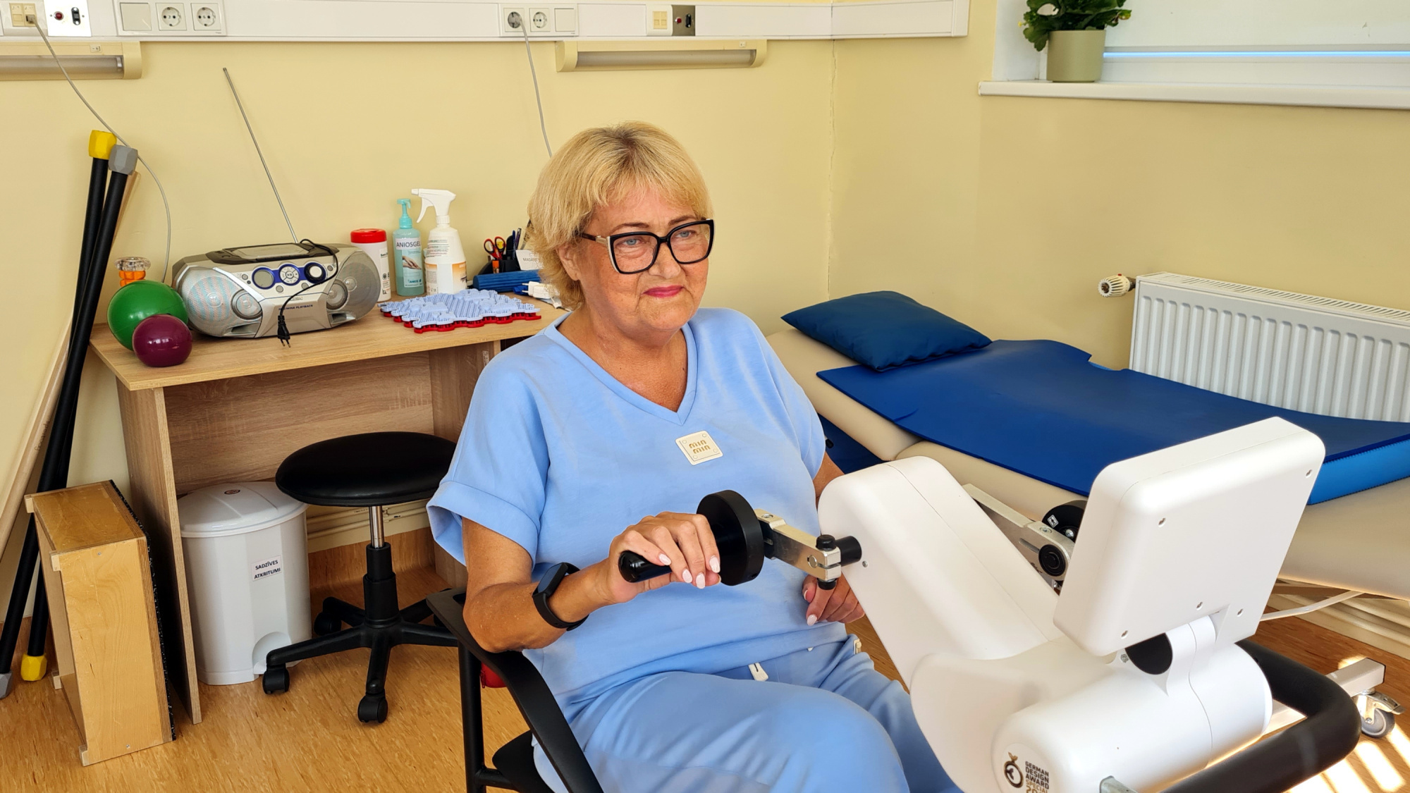 “Mēs esam uztrenējušies, slodzes tolerance ir palielinājusies,” stāsta Jēkabpils reģionālās slimnīcas Subakūtās rehabilitācijas nodaļas fizioterapeits Mārtiņš Lindmanis. “Sākam apgūt pakāpienus, paciente var pati nokāpt un uzkāpt pa trepēm nelielu attālumu. Trenējam spēku, izturību, progress ir salīdzinoši labs.”