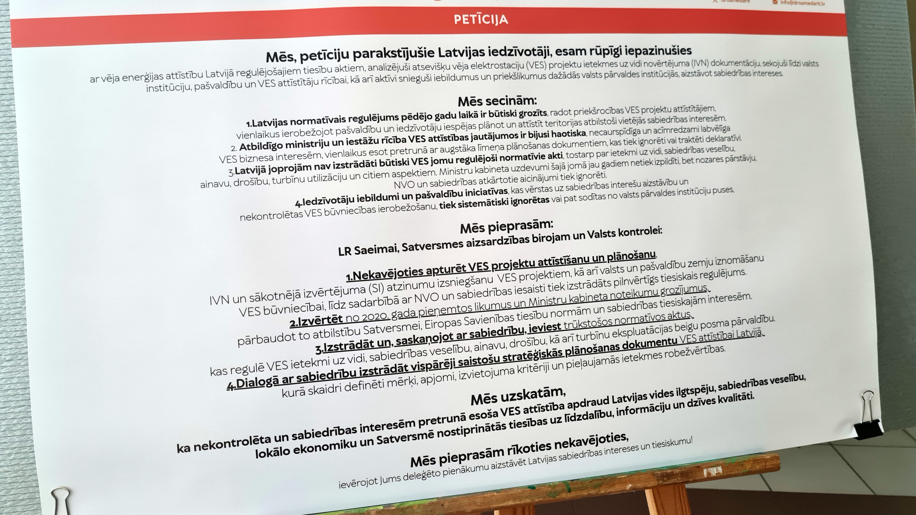 Petīcijā pausts aicinājums apturēt nekontrolēto vēja parku plānošanu un attīstību, izvērtēt iepriekš pieņemtos likumus un izstrādāt jaunu plānošanas dokumentu.
