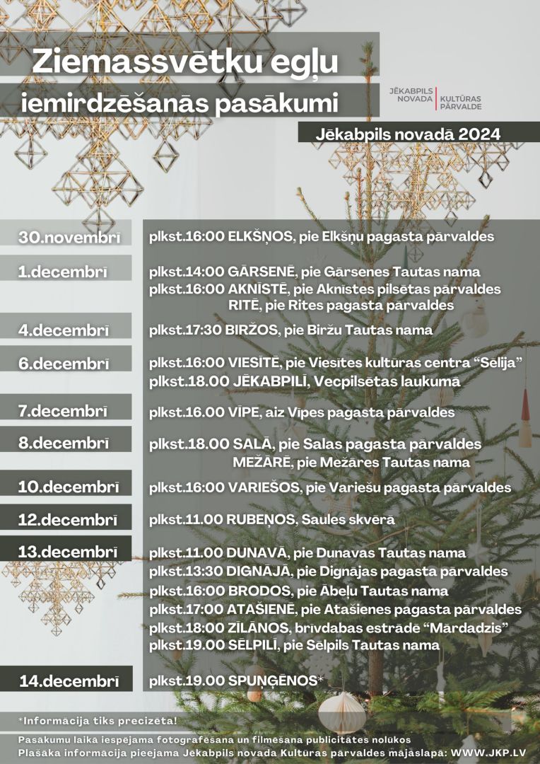 Jēkabpils novadā Ziemassvētku gaidīšanas laiks tiks ieskandināts ar eglīšu iemirdzēšanās svinībām, kas norisināsies dažādos pagastos un pilsētās. Pirmā svētku egle tiks iedegta 30. novembrī pie Elkšņu pagasta pārvaldes. Savukārt Gārsenē, Aknīstē un Ritē Ziemassvētku lampiņas iemirdzēsies pirmajā Adventē – 1. decembrī.