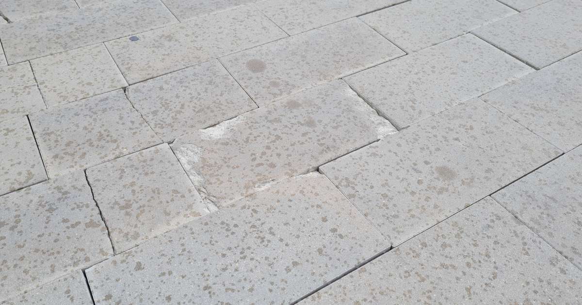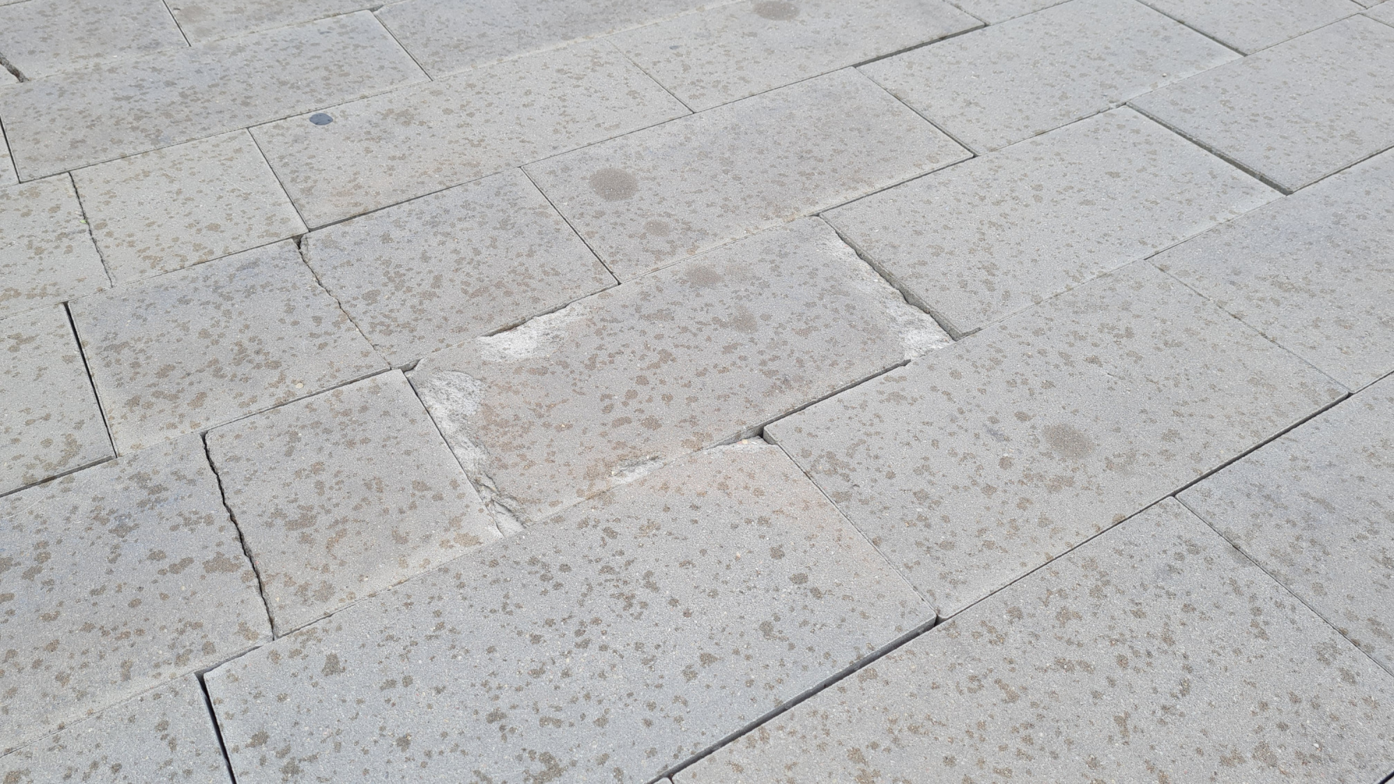 Vietām seguma plāksnes ir izdrupušas, vietām tās cilājas un ir izkustējušās, padarot virsmu nelīdzenu un ar plaisām.