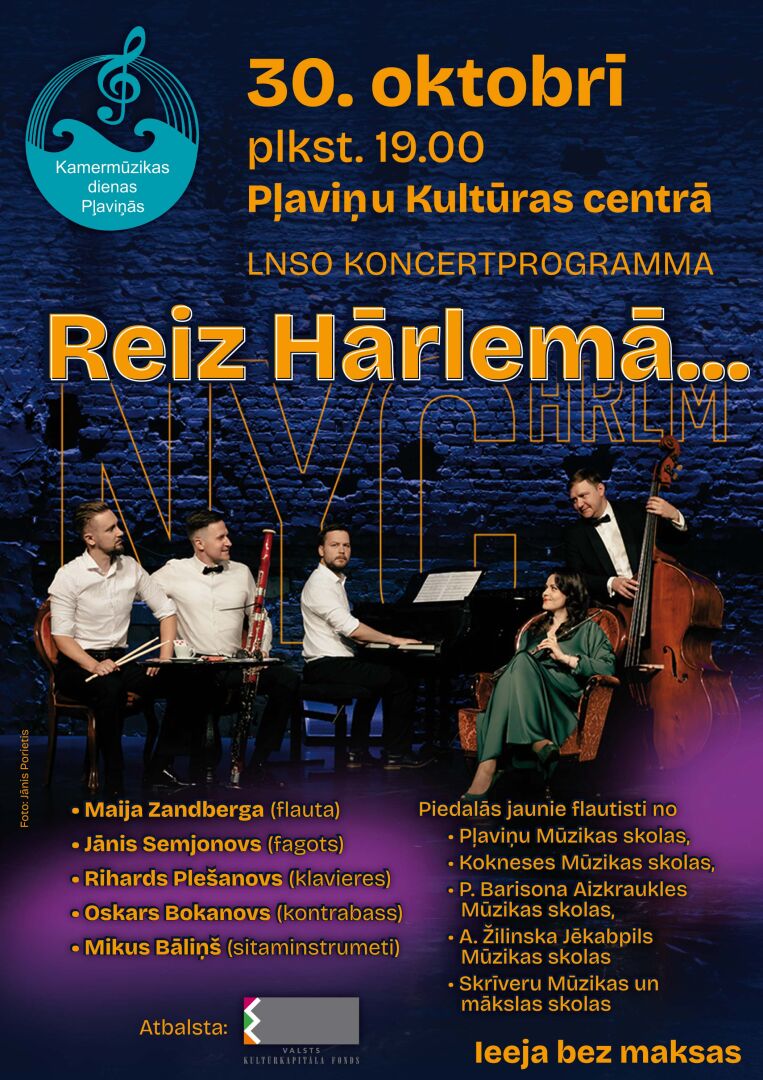Kamermūzikas dienas noslēgsies 30. oktobrī pulksten 19.00 Pļaviņu Kultūras centrā ar aizraujošu muzikālu ceļojumu, akadēmiskās mūzikas satikšanos ar džeza un izklaides mūziku LNSO koncertprogrammā "Reiz Hārlemā...". Pirms koncertprogrammas Aizkraukles novada mūzikas skolu un Arvīda Žilinska Jēkabpils Mūzikas skolas jaunie flautisti piedalīsies flautistes Maijas Zandbergas meistarklasē, kur kopīgā saspēlē pieslīpēs Kloda Bollinga (Claude Bolling) “Svītu flautai un džeza trio”. Pēc iedvesmojošas nodarbības viņi dosies uz skatuves, lai muzicētu kopā ar LNSO mūziķiem.
