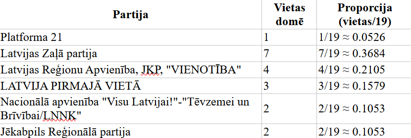 Skaitīsim kopā, lai noskaidrotu, kā šīs vietas Jēkabpils novada pašvaldības komitejās būtu jāizdala, ievērojot proporcionalitātes principu.