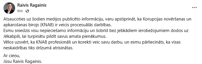 Raivis Ragainis sociālajā tīklā "Facebook" publicējis paziņojumu, norādot, ka ir sniedzis visu nepieciešamo informāciju un turpina pildīt savus amata pienākumus bez jebkādiem ierobežojumiem. "Vēlos uzsvērt, ka KNAB profesionāli un korekti veic savu darbu, un esmu pārliecināts, ka visas neskaidrības tiks drīzumā atrisinātas," raksta Ragainis, piebilstot, ka šobrīd dodas uz Jēkabpili, lai turpinātu darbu.