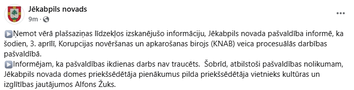 Savukārt Jēkabpils novada pašvaldība, reaģējot uz plašsaziņas līdzekļos izskanējušo informāciju, paziņoja, ka šodien, 3. aprīlī, KNAB veica procesuālās darbības pašvaldībā. Pašvaldība uzsvēra, ka tās ikdienas darbs nav traucēts. Tāpat tika norādīts, ka atbilstoši pašvaldības nolikumam Jēkabpils novada domes priekšsēdētāja pienākumus šobrīd pilda priekšsēdētāja vietnieks kultūras un izglītības jautājumos Alfons Žuks.