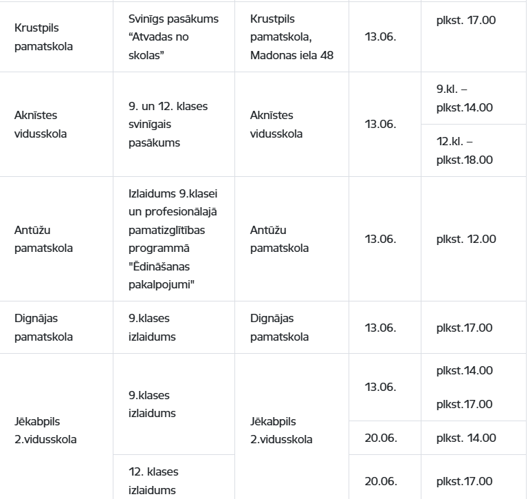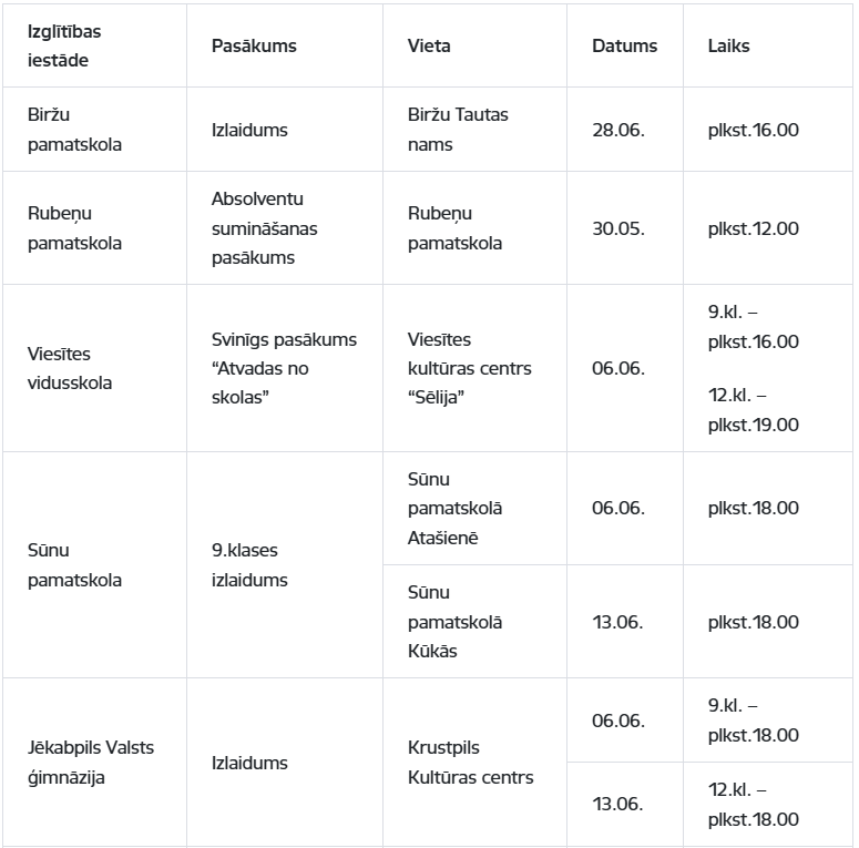 Jēkabpils novada Izglītības pārvalde publicējusi 2024./2025. mācību gada 9. un 12. klašu izlaidumu sarakstu. Izlaidumu laiks novada vispārizglītojošajās skolās jau ir sācies. Svinīgie pasākumi daudzās mācību iestādēs notiks 6. un 13. jūnijā, bet ir skolas, kurās izlaidumi paredzēti 19, 20., 27. un 28. jūnijā. Šā gada pēdējais vispārizglītojošo skolu izlaidums būs 4. jūlijā, kad no savas skolas atvadīsies Jēkabpils 3. vidusskolas 12. klases.