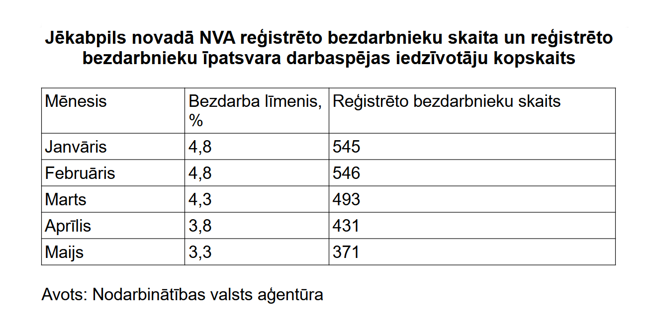 Šā gada pirmajos piecos mēnešos caur aģentūru darbā iekārtojušies 622 Jēkabpils novada iedzīvotāji – no tiem 177 ziemā, bet 445 pavasarī.