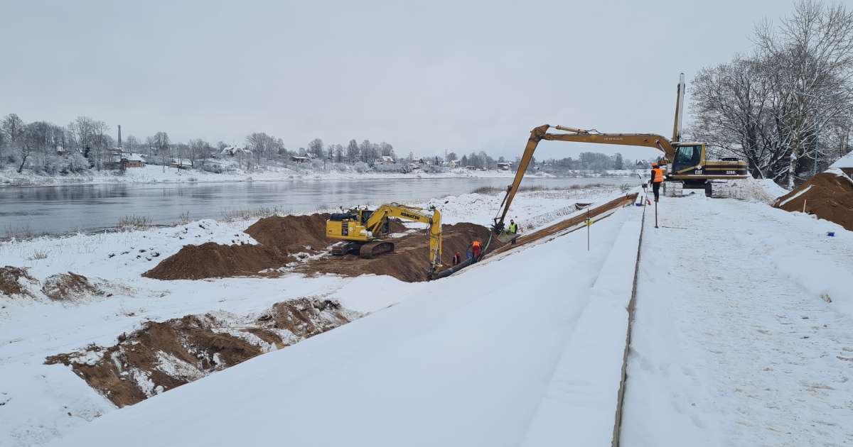 SIA “Jēkabpils PMK” turpina veikt Daugavas aizsargdambja būvdarbus Jēkabpilī. Lai gan uzsnigušais sniegs apgrūtina darbu norisi, pagaidām laika apstākļi nav tik nepiemēroti, lai būtu darbi jāpārtrauc. Būvdarbu vadītājs Jānis Dimants skaidro, ka darbi bija apstājušies snigšanas laikā, jo puteņa dēļ nebija iespējams strādāt, bet tagad, kad snigšana mitējusies, strādnieki atkal rosās objektā. Biezās sniega segas dēļ no rītiem darbiniekiem jāvelta ilgāks laiks, lai sagatavotu teritoriju darbiem, bet pagaidām tehnoloģiskais pārtraukums netiek izsludināts. Jānis Dimants nevarēja nosaukt precīzus apstākļus, kādiem iestājoties, darbi būs jāpārtrauc, vien minēja, ka viens no faktoriem ir stiprāks sals. Tuvāko nedēļu laikā plānots pabeigt dambja slapjās nogāzes visu kārtu izbūvi 167 metru garā posmā pie Jēkabpils tilta pār Daugavu.