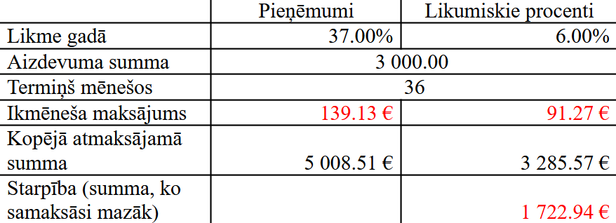 Ja patērētājam ir kredīts 3000 eiro uz 36 mēnešiem ar aizņēmuma procentu likmi 37% un visā termiņā kopā būtu jāsamaksā 5008.51 EUR, tad gadījumā, ja maksātspēju kredīta devējs nav izvērtējis atbilstoši, var panākt, lai par kredītu jāmaksā 6% gadā (likumiskie procenti), tātad kopā jāsamaksā 3285.57 EUR. Tātad būtu jāmaksā par 1722.94 EUR mazāk.