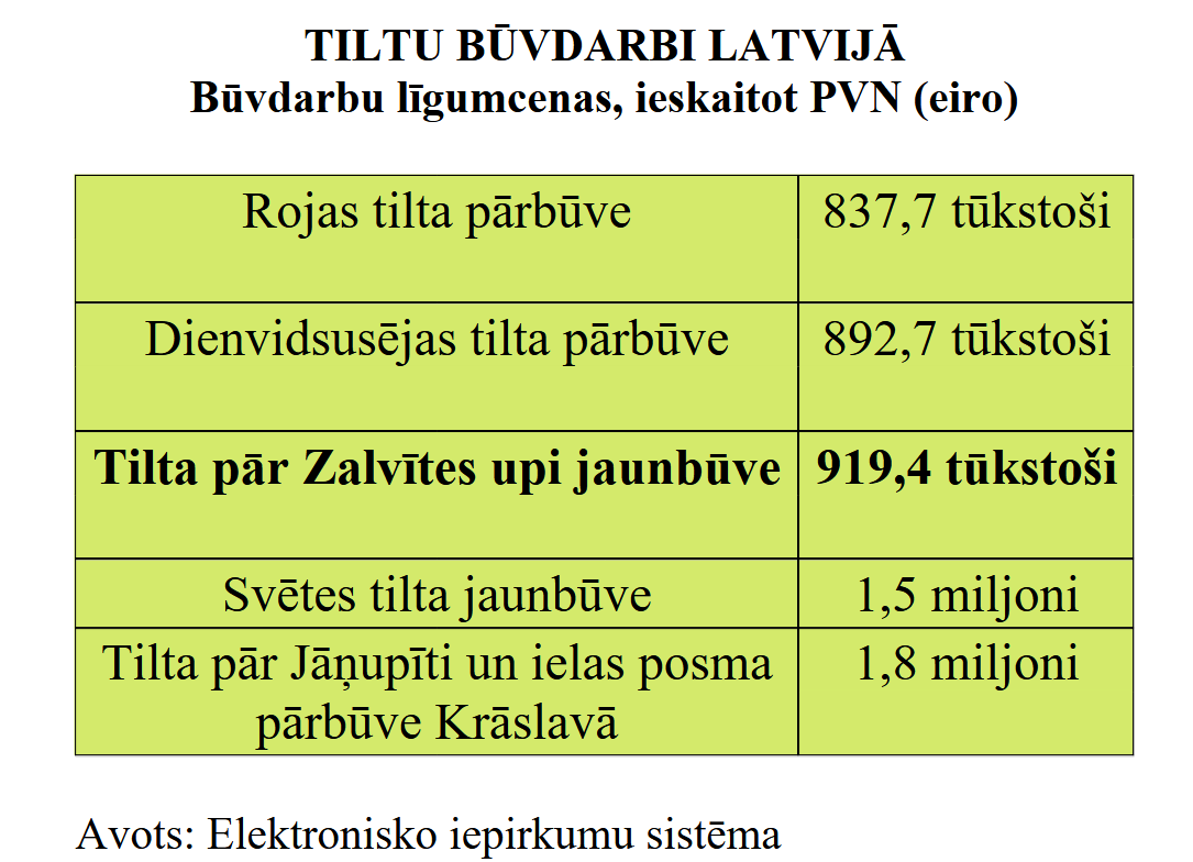 Apskatot iepirkumus par citu tiltu pārbūvi Latvijā, izmaksas ir līdzīgas vai vēl lielākas nekā Zalvītes upes tiltam. Tomēr jāņem vērā, ka katram tiltam ir atšķirīga situācija, no kuras atkarīgs arī būvdarbu apjoms un izmaksas.