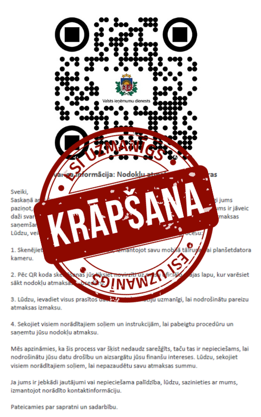 Krāpnieki uzdodas par Valsts ieņēmumu dienestu un aicina veikt noteiktas darbības saistībā ar nodokļu atmaksu, kur iedzīvotājam ir jānoskenē e-pastā atsūtītais QR kods, pēc kā, nonākot viltus mājaslapā un ievadot savus bankas datus, un apstiprinot SMART-ID kodus, no iedzīvotājiem tiek izkrāpti naudas līdzekļi.