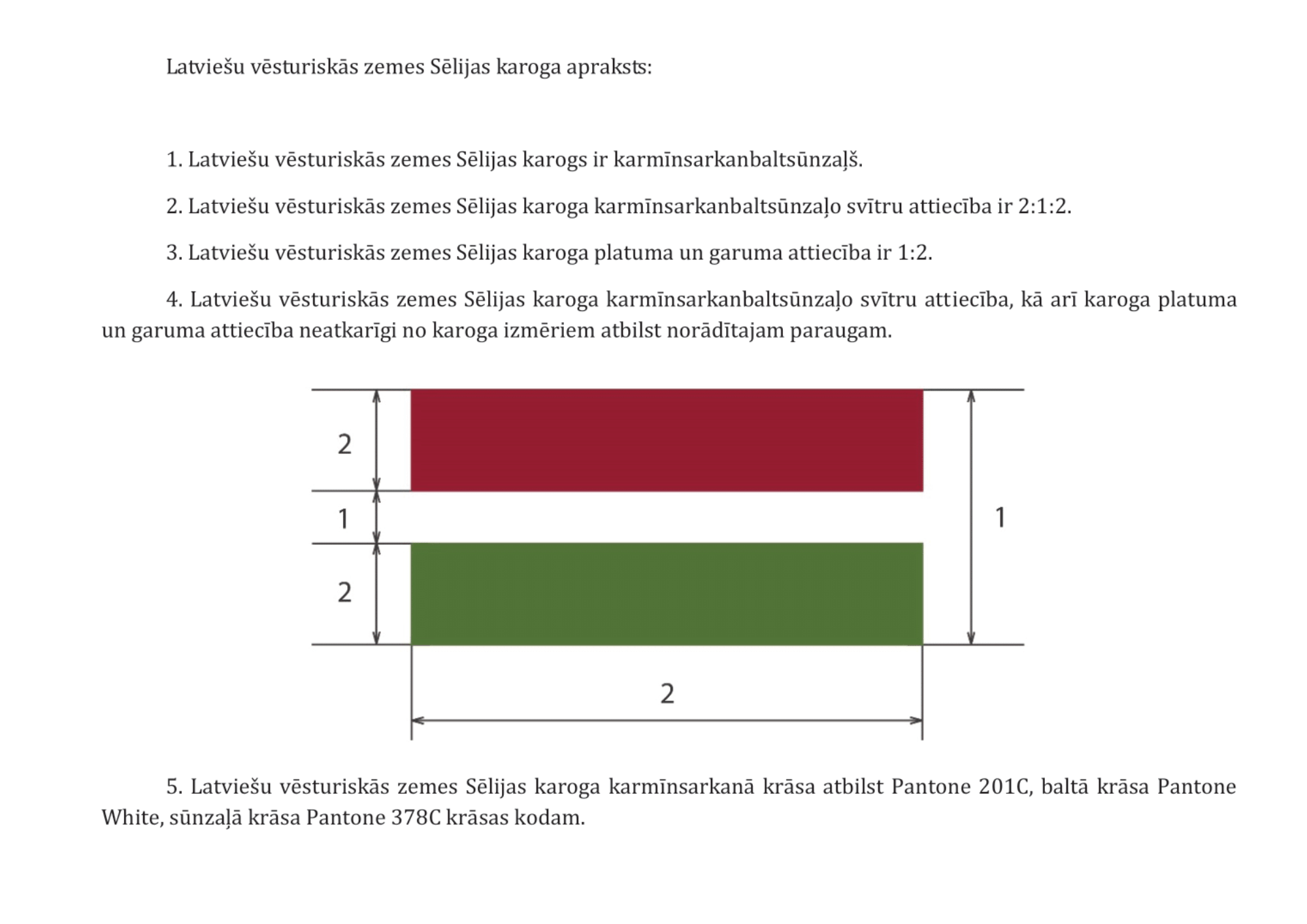 “Latviešu vēsturiskās zemes Sēlijas karoga karmīnsarkanā krāsa atbilst “Pantone 201C”, baltā krāsa “Pantone White”, sūnzaļā krāsa “Pantone 378C” krāsas kodam,” precizēts rīkojuma pielikumā.