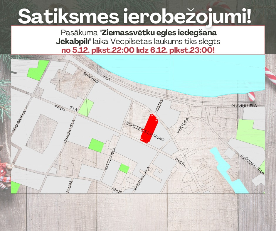 Vecpilsētas laukums Jēkabpilī vienu diennaktī būs slēgts transportlīdzekļu satiksmei, informē Jēkabpils novada pašvaldībā. Ierobežojumi noteikti saistībā ar Ziemassvētku egles iedegšanas pasākumu. Satiksme būs slēgta no 5. decembra pulksten 22:00 līdz 6. decembra pulksten 23:00. Pilsētas iedzīvotāji un viesi aicināti ievērot ceļa zīmes un būt saprotošiem.