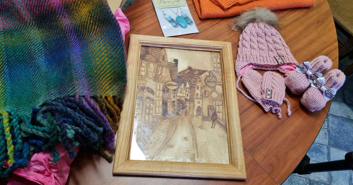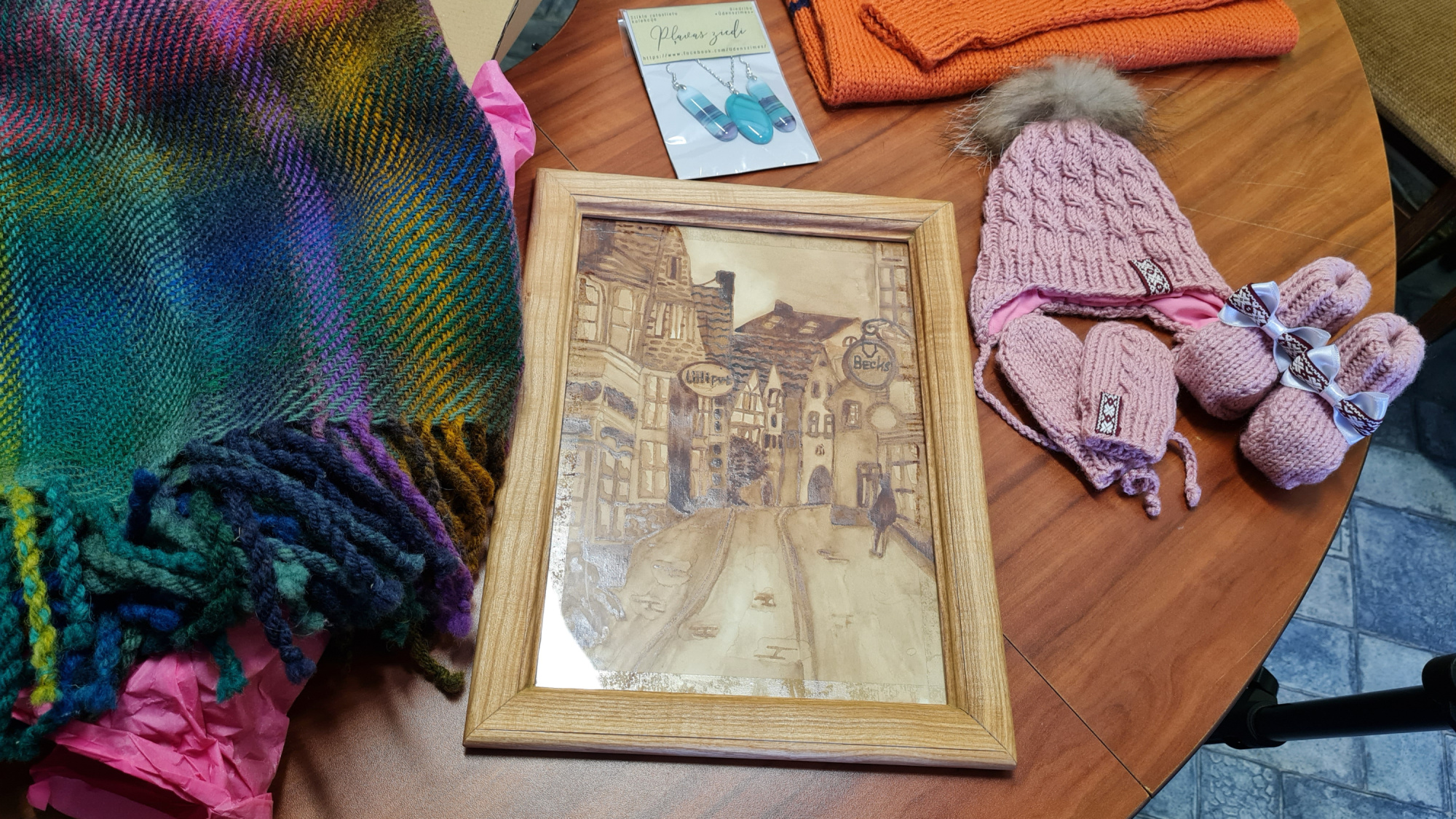“Daļa cilvēku ir mūsu pašu biedrības dalībnieki, piemēram, no senioru centra,” stāsta izsoles koordinatore Madara Borisova. “Kundze, kas ada, redz tikai pusmetra attālumā, bet viņa ada ļoti skaistus darbus. Ir arī citi meistari, ne tikai no mūsu biedrības. Ir ļoti skaists ukraiņu meitenes darbs. 14-gadīga meitene ārkārtīgi skaisti glezno, un viņa savu darbiņu uzgleznojusi ar kafiju.”