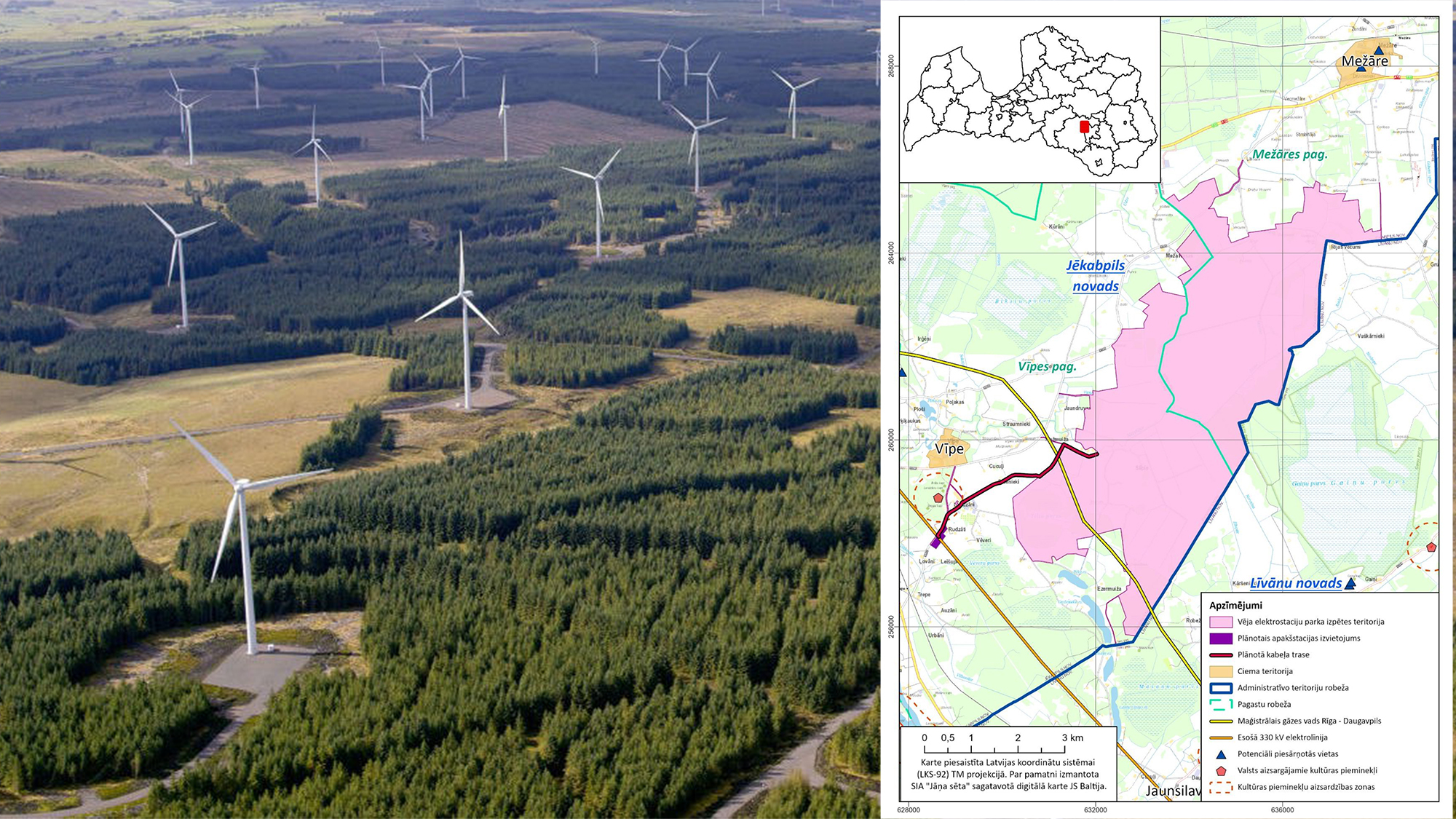 Jēkabpils novada Vīpes un Mežāres pagastā uzņēmums SIA “PurpleGreen Solwin” ir iecerējis būvēt vēja parku, izvietojot vēja ģeneratorus 2989 hektāru plašā teritorijā. Šobrīd tur lielākoties atrodas lauksaimniecībā un mežsaimniecībā izmantojamās zemes. Teritorijā ir arī viensētas, bet atbilstoši normatīvo aktu prasībām vēja elektrostacijas iecerēts izvietot vismaz 800 metru attālumā no jebkuras dzīvojamās vai publiskās ēkas. Vēja elektrostaciju parka izpētes teritorijā ietilpst 224 zemes vienības vai to daļas, kuru īpašnieki vai valdītāji lielākoties ir juridiskas personas. SIA “PurpleGreen Solwin” uzsver, ka vēja elektrostacijas un ar tām saistītā infrastruktūra tiks izbūvēta tikai tajās zemes vienībās, ar kuru valdītājiem tiks panākta vienošanās par energoapgādes objektu izvietošanu un būvniecību.