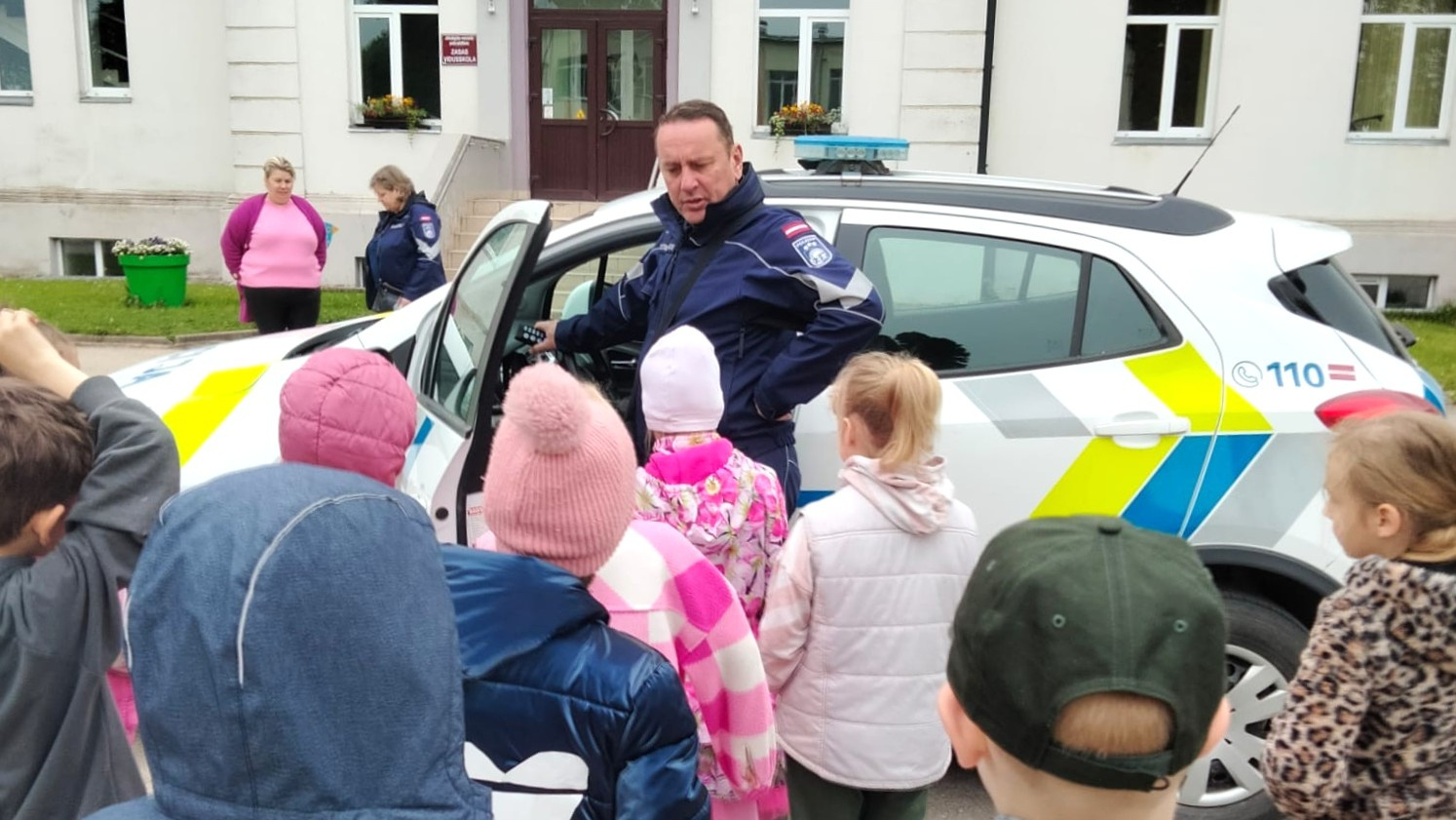 Inspektore D.Stivriņa uzdeva jautājumus un par pareizām atbildēm izsniedza nozīmītes ar policijas logo.