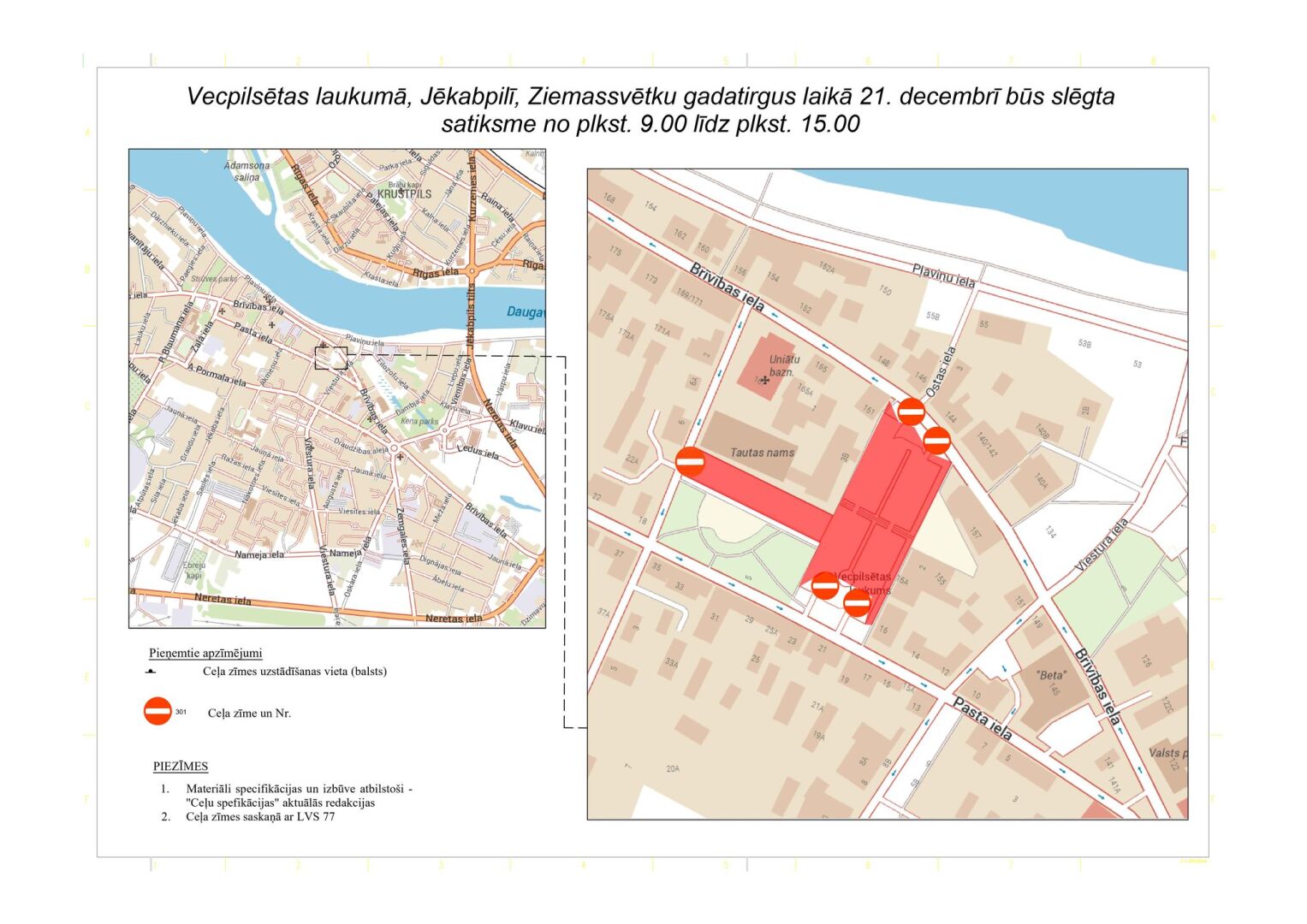 21. decembrī no pulksten 9.00 līdz 15.00 Jēkabpils Vecpilsētas laukumā tiks slēgta satiksme.